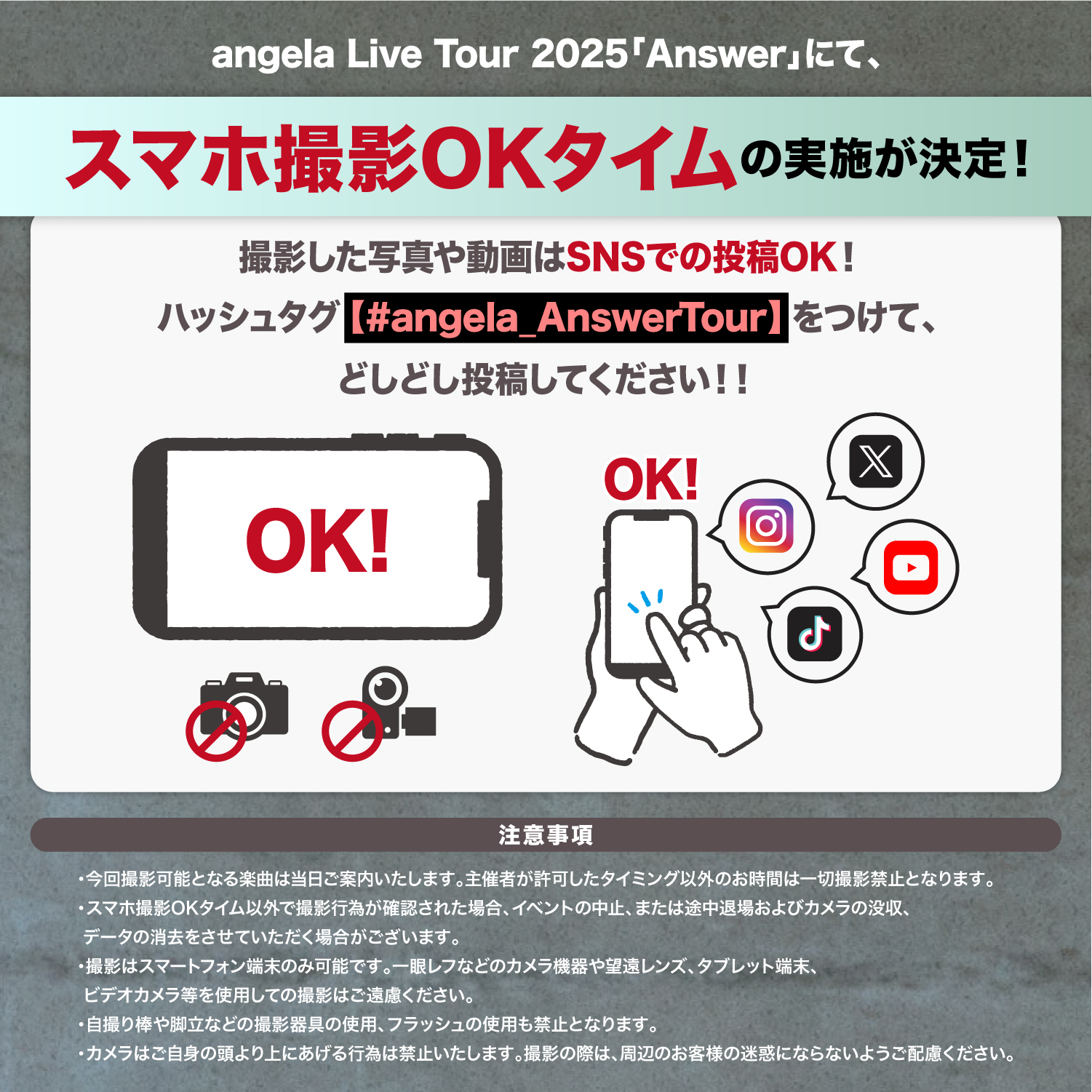 angela Live Tour 2025「Answer」を皆様にも楽しんでいただくため、開場中の会場内の撮影、および、一部の楽曲にて写真・動画撮影が可能です。是非SNSなどで拡散してください。