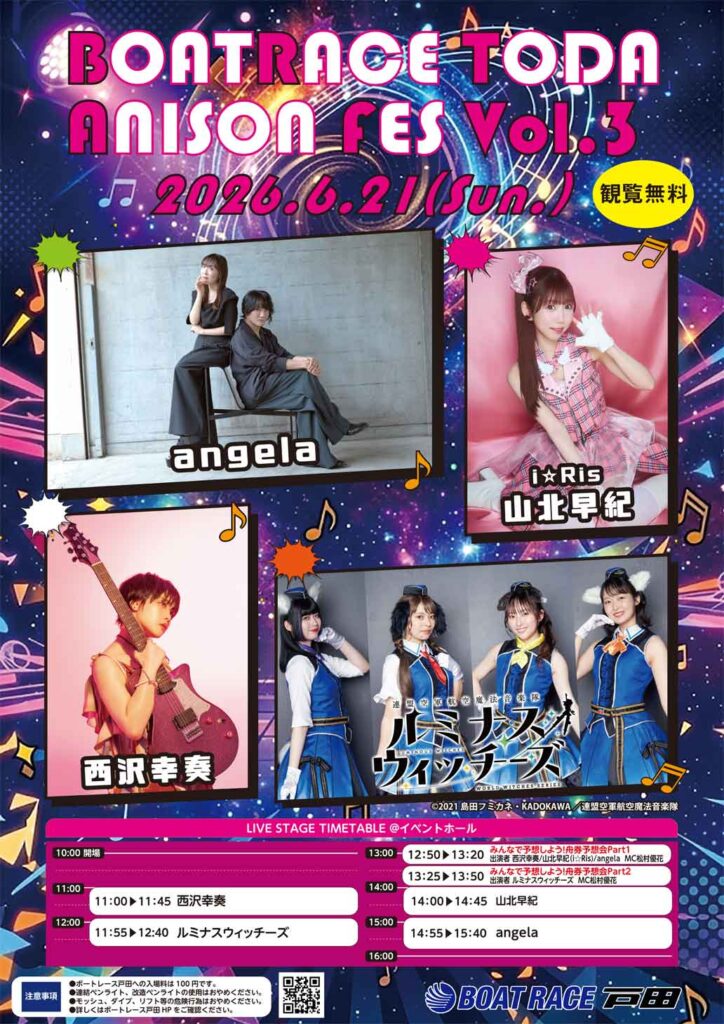 2026年6月21日、ボートレース戸田イベントホールにて開催される「BOATRACE TODA ANISON FES Vol.3」に、angelaの出演が決定しました。